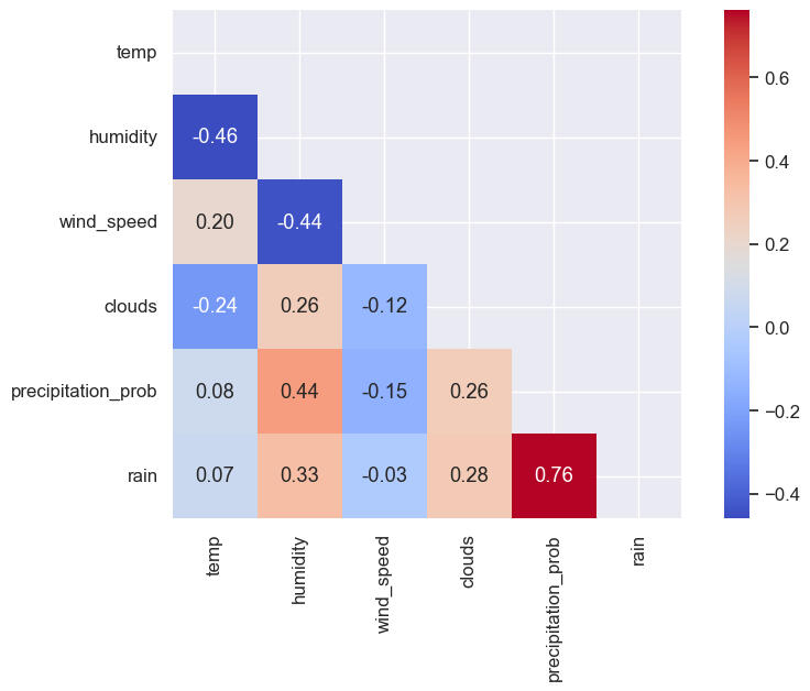 Observations:The negative correlation between humidity/clouds and temperature make sense, since the humid days tend to be cloudy. The strong correlation between rain and precipitation_probablity needs no explanation.