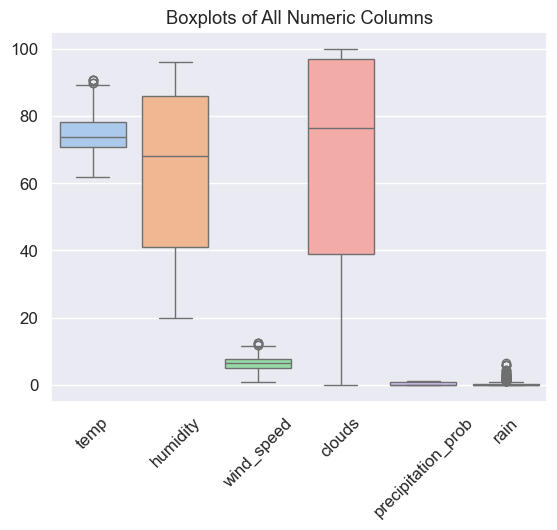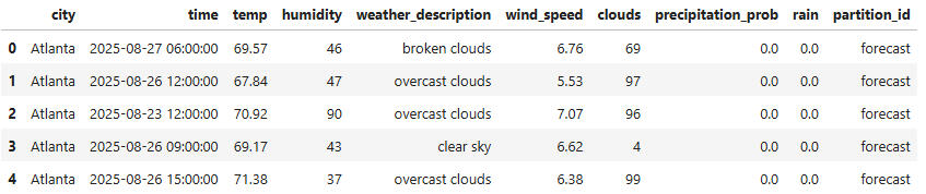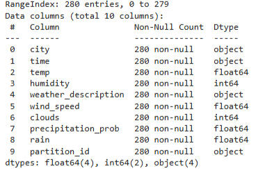 The data came into the S3 bucket in the form of very heavily nested JSON files, which is apparently typical for weather forecasts. After crawling the files, I used a Glue job to create a well-formatted and usable csv file. One issue was the Rain column, where if no rain was predicted the value was NaN instead of 0, so I changed them to 0. This led to the following characteristics of the dataset: